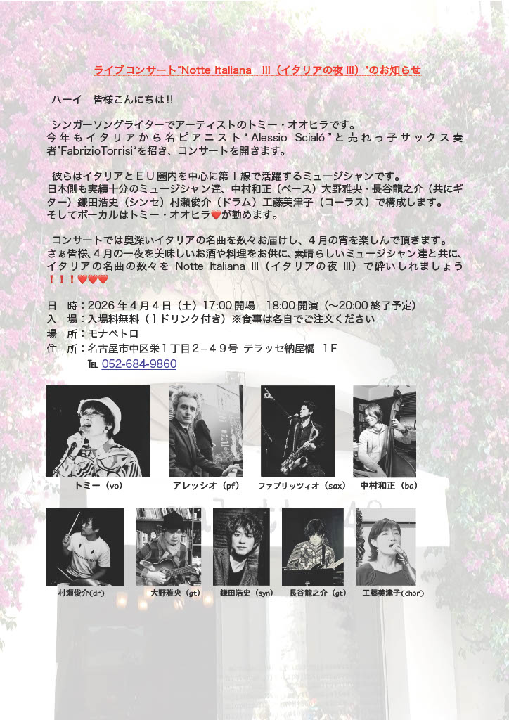 シンガーソングライターでアーティスト、そして、イタリア🇮🇹の歌、愛好家のトミー•オオヒラです❗️🎶
